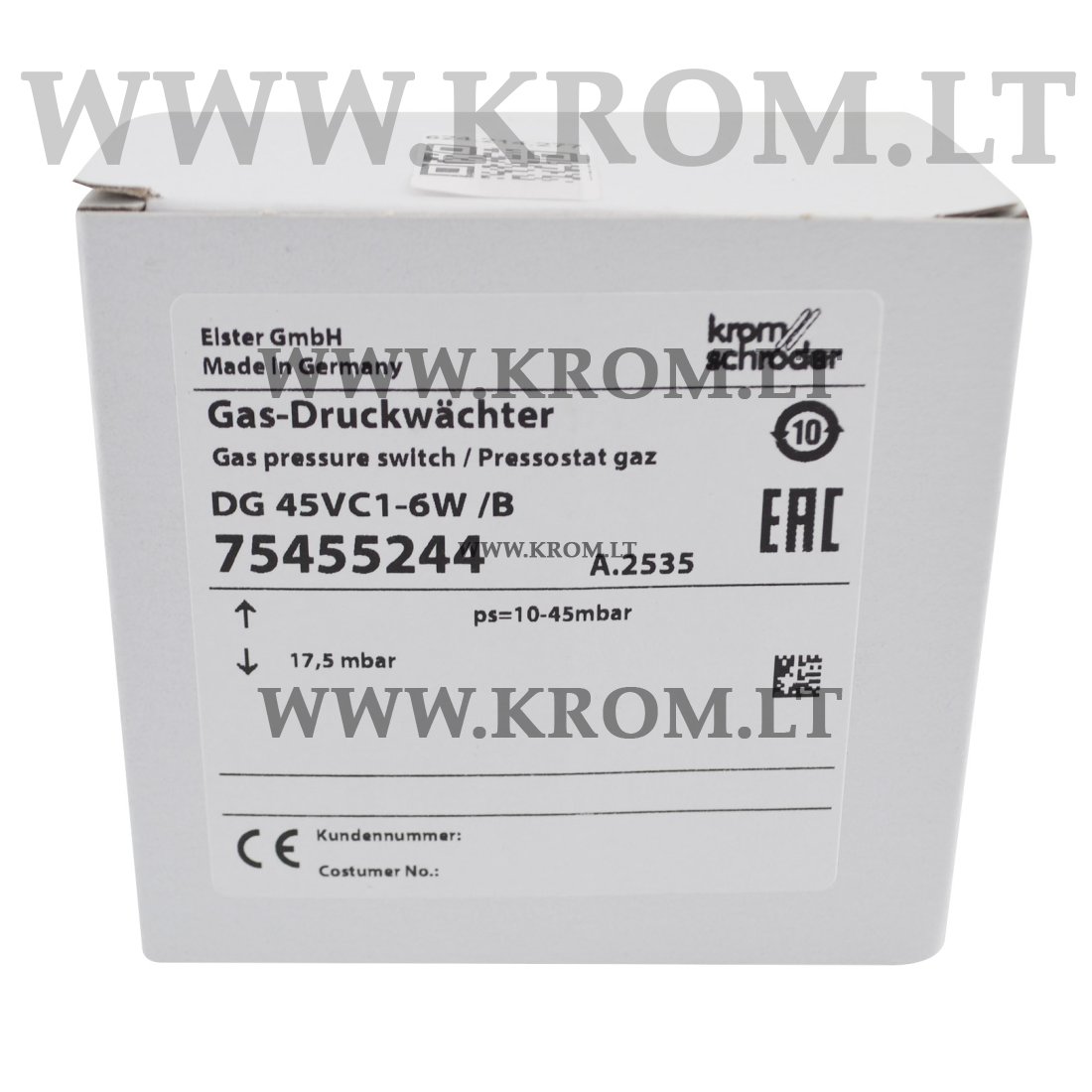 Replacing a Kromschroder DG 45VC1-6W /B, 75455244 pressure switch for gas is a good solution to make your equipment work again. We offer a wide range of Kromschroder spare parts for burners, gas trains etc. We supply original Elster (Kromschröder) & Honeywell (Maxon) products.